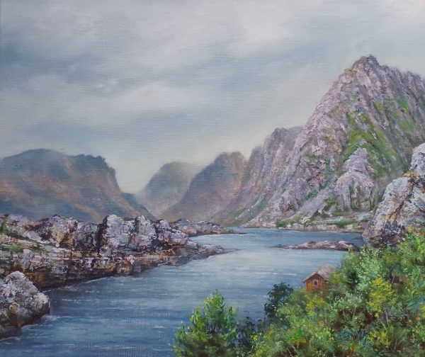 This is an oil painting on board (30cms x 25cms) of a view on the road from Henningsvaer, Lofoten. A stunning village with beautiful views over islands and mountains and also, of course, a famous football pitch
